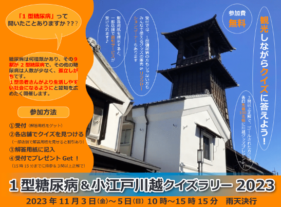 1型糖尿病や糖尿病全体のことを知らない人に理解を広めるべく観光地川越の店舗にクイズを掲示。参加者の方に観光しながら知っていただくクイズラリーイベント。参加者特典として、3問以上正解の方に川越グッズプレゼント。店舗一部5%引きなどあります。川越に行くきっかけを探してる方、川越好きな方、1型スタッフもいます。ふらっとお話に来たり、クイズラリー参加して知識を増やしたり、友達や家族や当事者同士やお散歩しながら巡って語り合うも楽しみ方は自由。お店は川越住民のおすすめ店舗様にご協力いただいています。どうぞ楽しみにお越しください。
